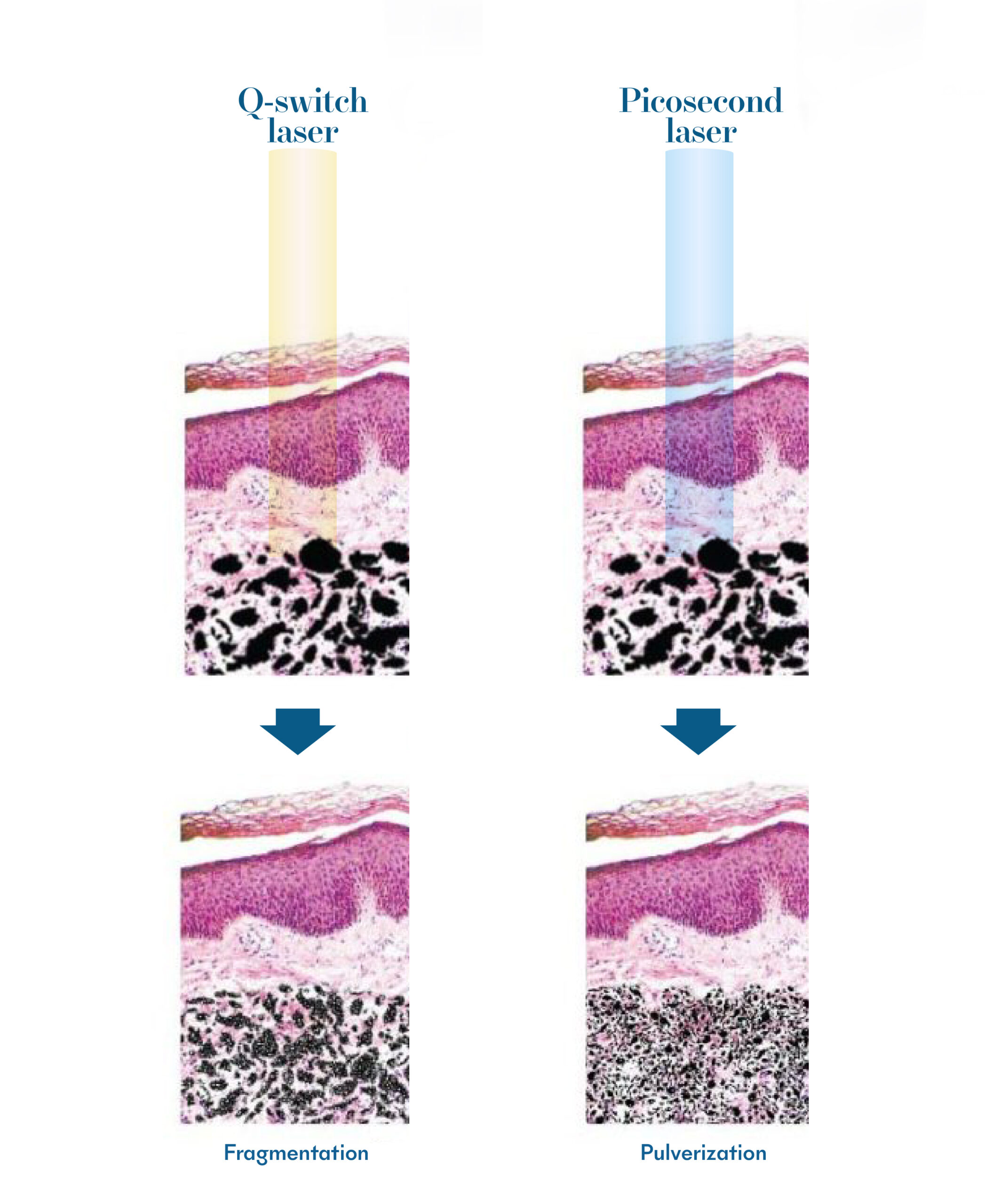 Pico-second is a measure of time. 1000 pico-seconds = 1 nano-second. The pico laser delivers ultrashort picosecond pulses, compared to the longer nanosecond pulses. The pulse duration (how much time one laser shot stays on the skin) of a picosecond laser is 100 times shorter, allowing more shots to be delivered in the same amount of time. This means the skin heats up less, which may reduce the risk of hyperpigmentation sometimes associated with laser procedures.
