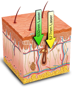 At 577nm wavelength, the Yellow laser is particularly useful for epidermal pigmentation such as superficial freckles, some sun spots, age spots, and stubborn conditions such as vascular melasma. Vascular melasma is a multi-layer pigmentation condition that results from an increase in blood vessels under the skin. These blood vessels are reduced with the Yellow laser which, in turn, reduces pigmentation.