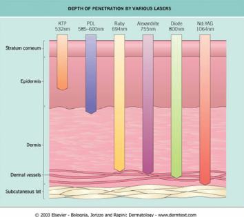 The Ruby laser, at 694nm wavelength, is used to treat epidermal pigmentation, such as freckles, sun spots, lentigos, and age spots, as well as some dermal pigmentation such as melasma.